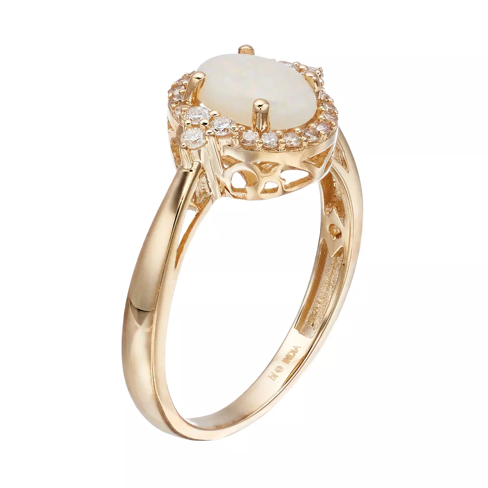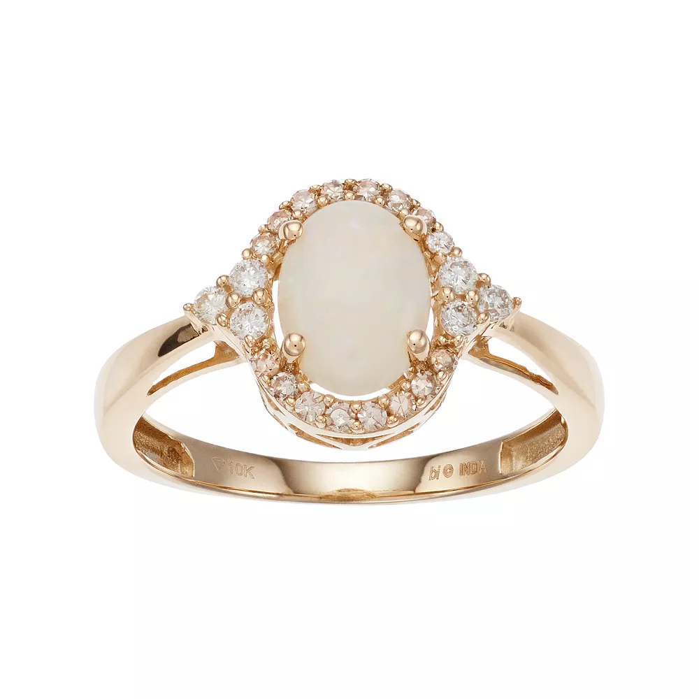 Decorated with an illuminating opal center stone and shimmering diamond accents, this 10k gold halo ring abounds with timeless beauty.