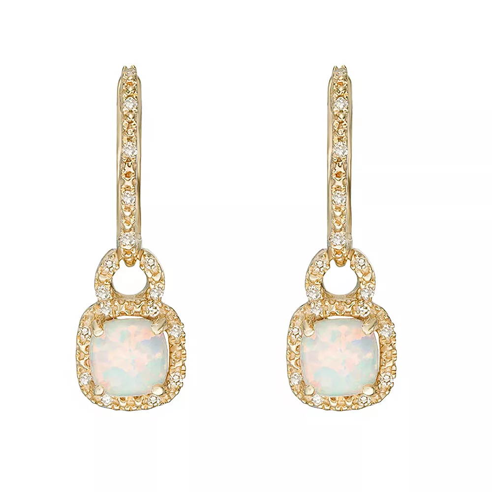 Featuring diamonds and opals, these hoop drop earrings offer stunning one-of-a-kind style.