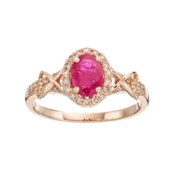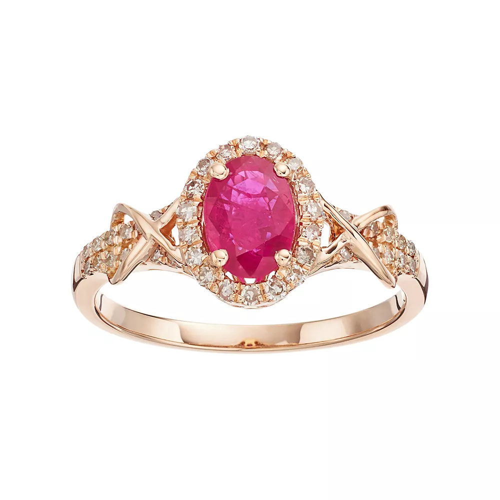 An oval-cut genuine ruby center stone serves as the focal point on this 10k rose gold halo ring, while diamond accents add eye-catching sparkle.