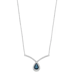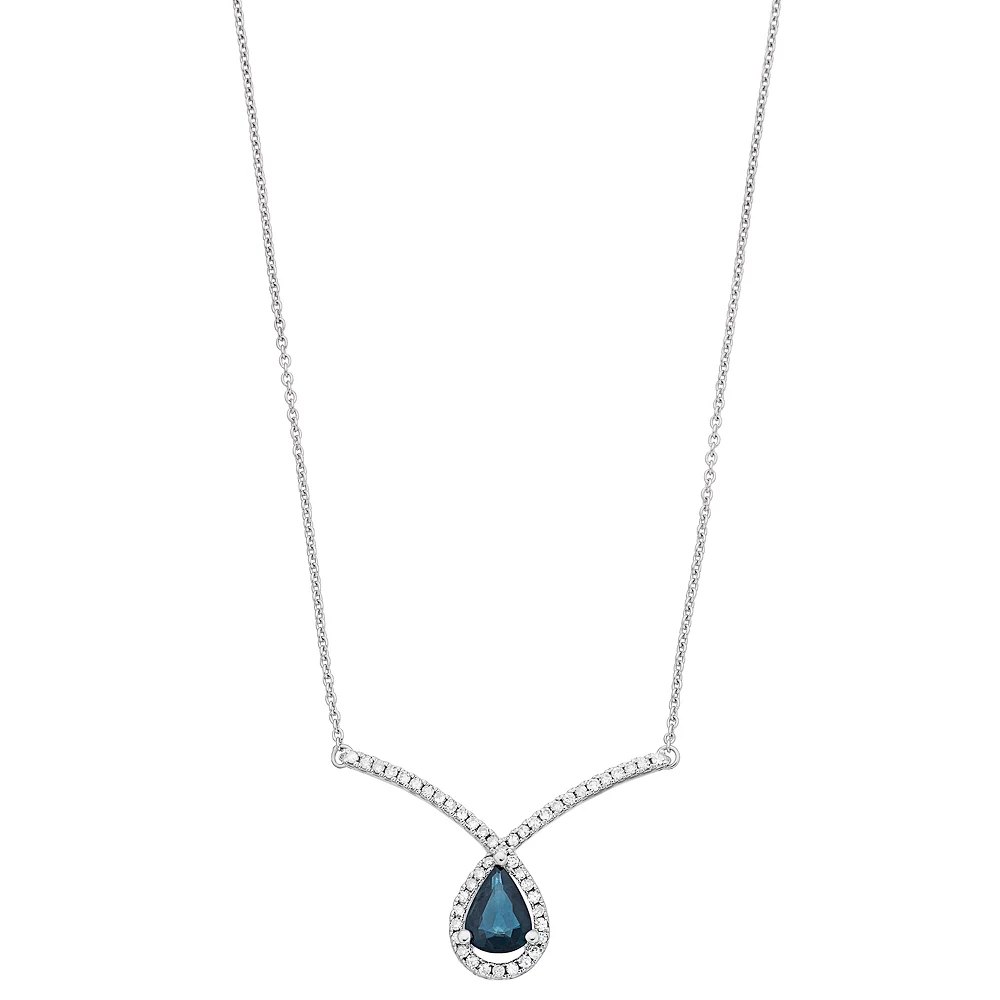 Designed with a gorgeous teardrop-shaped sapphire center stone accented with radiant diamonds, this 10k white gold necklace abounds with alluring appeal.