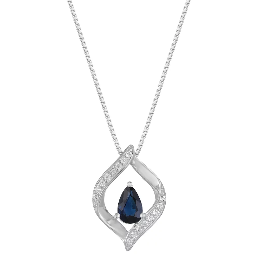 This 10k white gold pendant necklace showcases a sapphire and diamond accents for a piece that you’re sure to love.