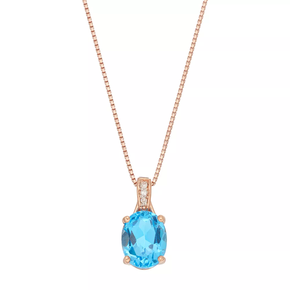 Decorated with an oval blue topaz center stone and shimmering diamond accents, this 14k rose gold over silver pendant makes an alluring accessory.