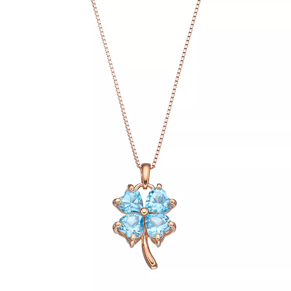 Featuring a four-leaf clover design adorned with heart-cut blue topaz stones, this 14k rose gold over silver pendant necklace is perfectly chic.