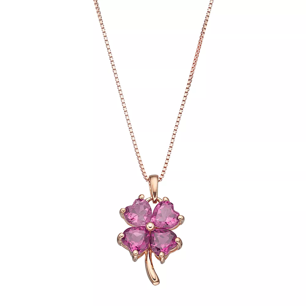 Featuring a four-leaf clover design adorned with lab-created pink sapphire stones, this 14k rose gold over silver pendant necklace is perfectly chic.