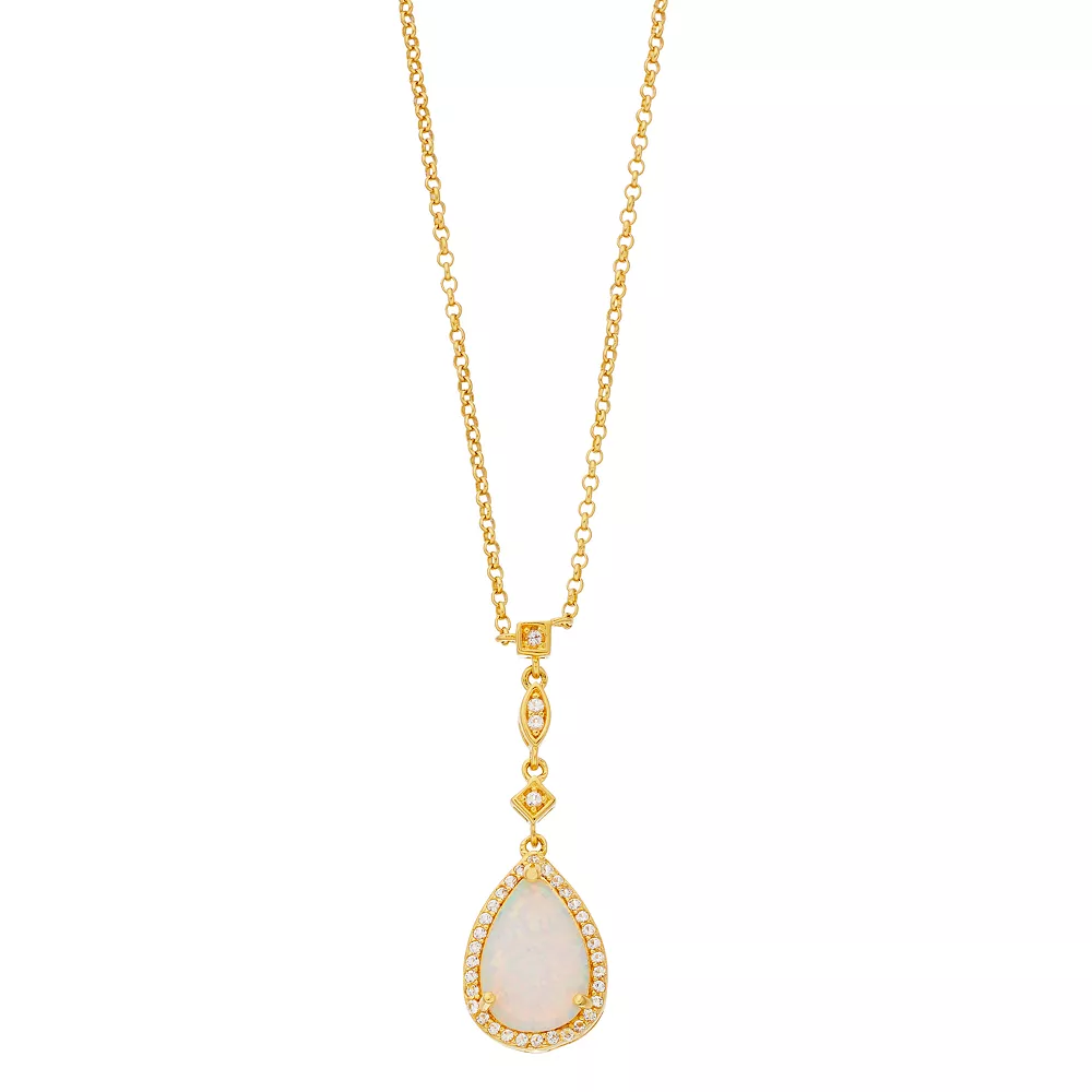 A lab-created opal, surrounded by white topaz dangles delicately from an 18k gold chain, making this pendant necklace a lovely accessory.