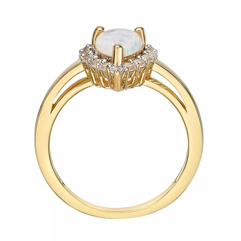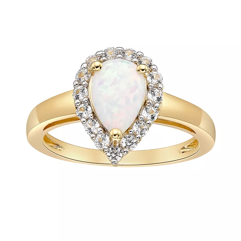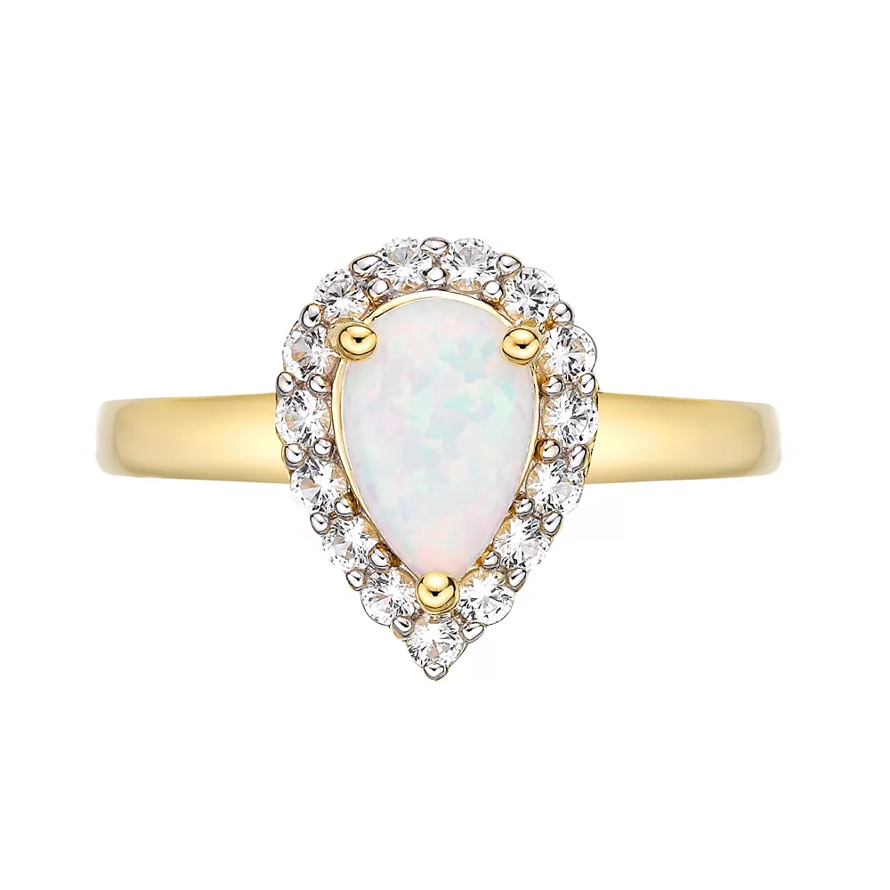 Make a statement with this stunning ring, featuring a beautiful, pear-shaped, lab-created opal stone haloed by lab-created white sapphire accents.