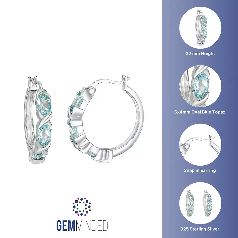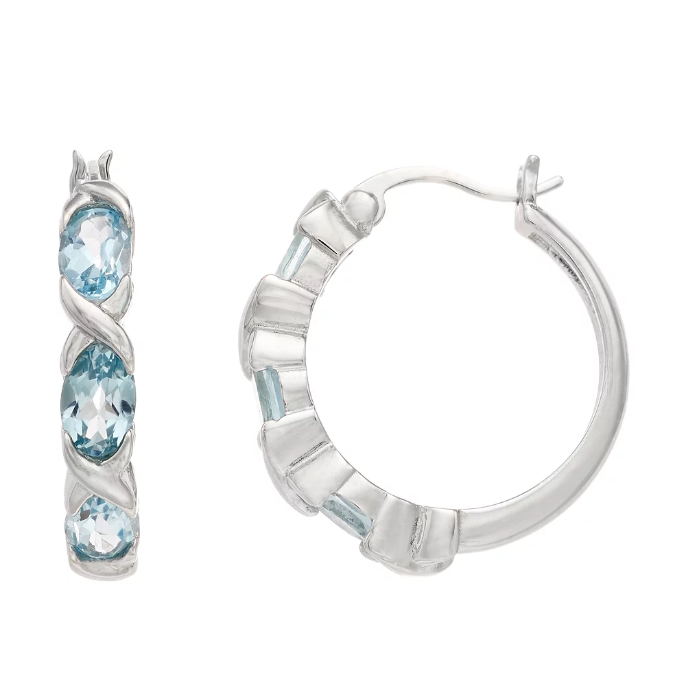 Genuine blue topaz decorates these silver-tone hoop earrings, making them an elegant accessory.