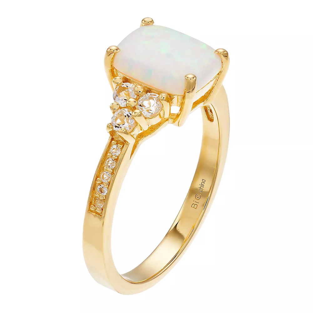 A lab-created opal surrounded by white topaz stones makes this gold over sterling silver ring a charming accessory.