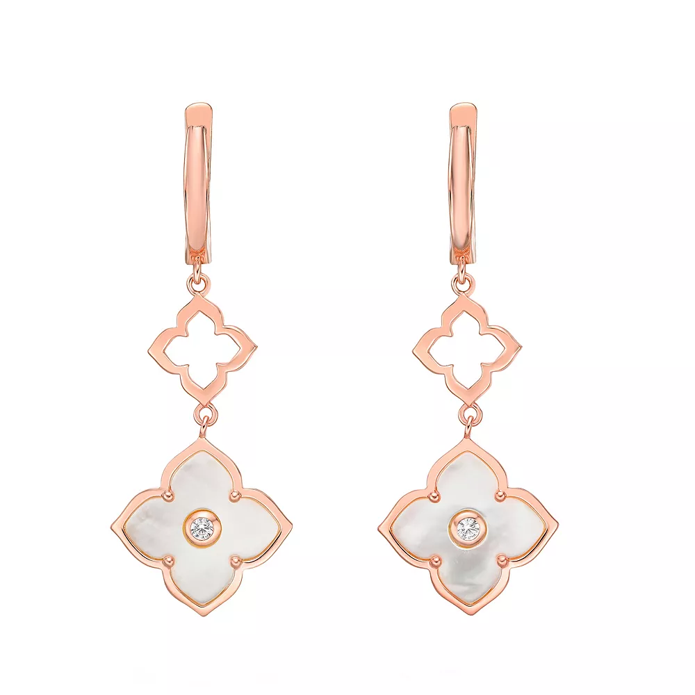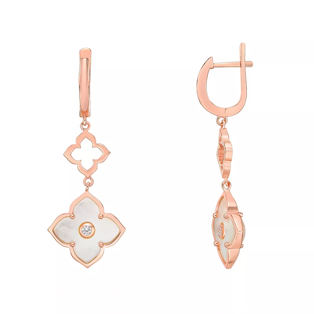These gorgeous rose gold over sterling silver mother-of-pearl and cubic zirconia flower earrings showcase a double drop design that you are sure to love showing off.