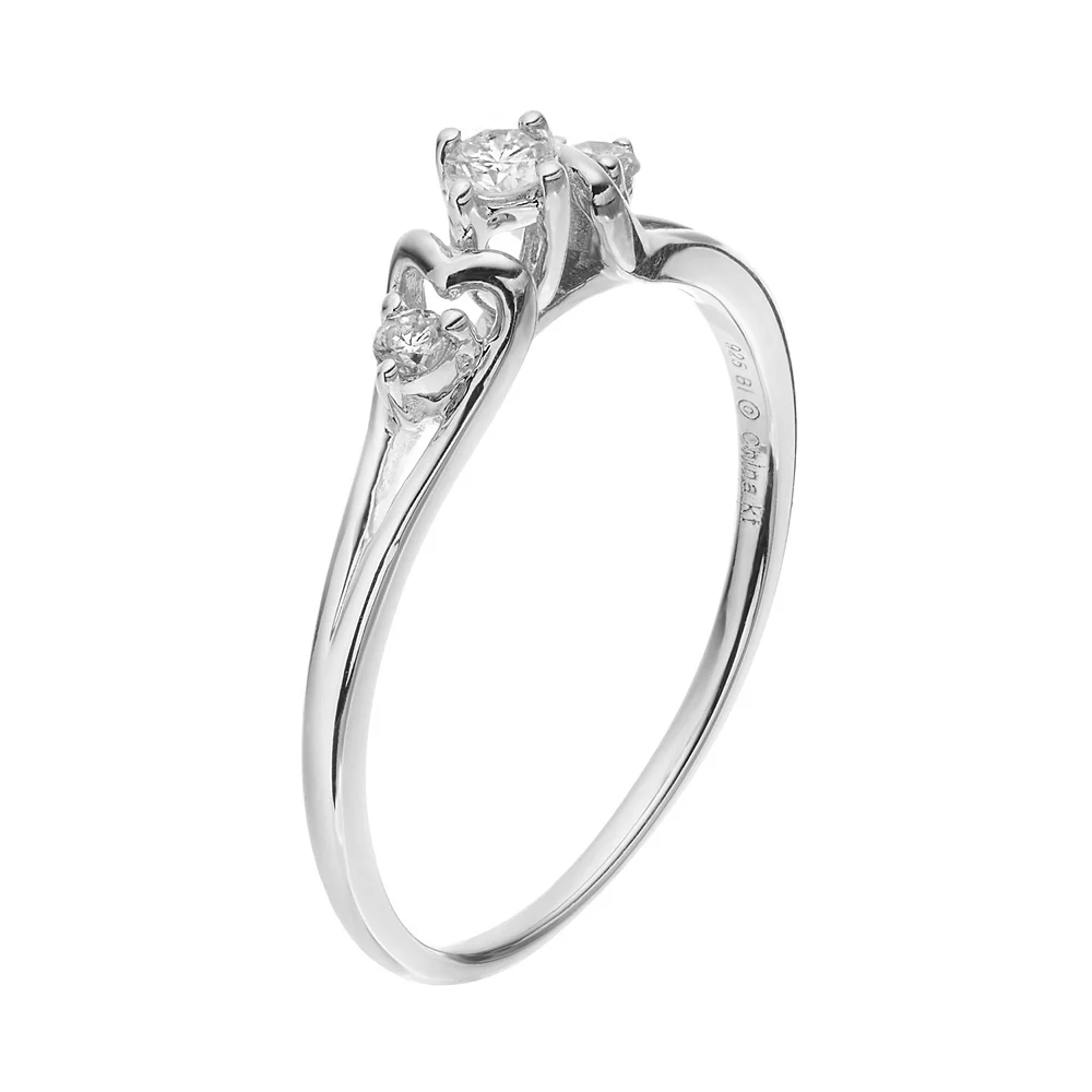 Featuring a three-stone motif decorated with round-cut diamonds and a split-shank band, this promise ring conveys your everlasting love.