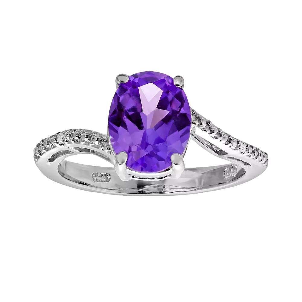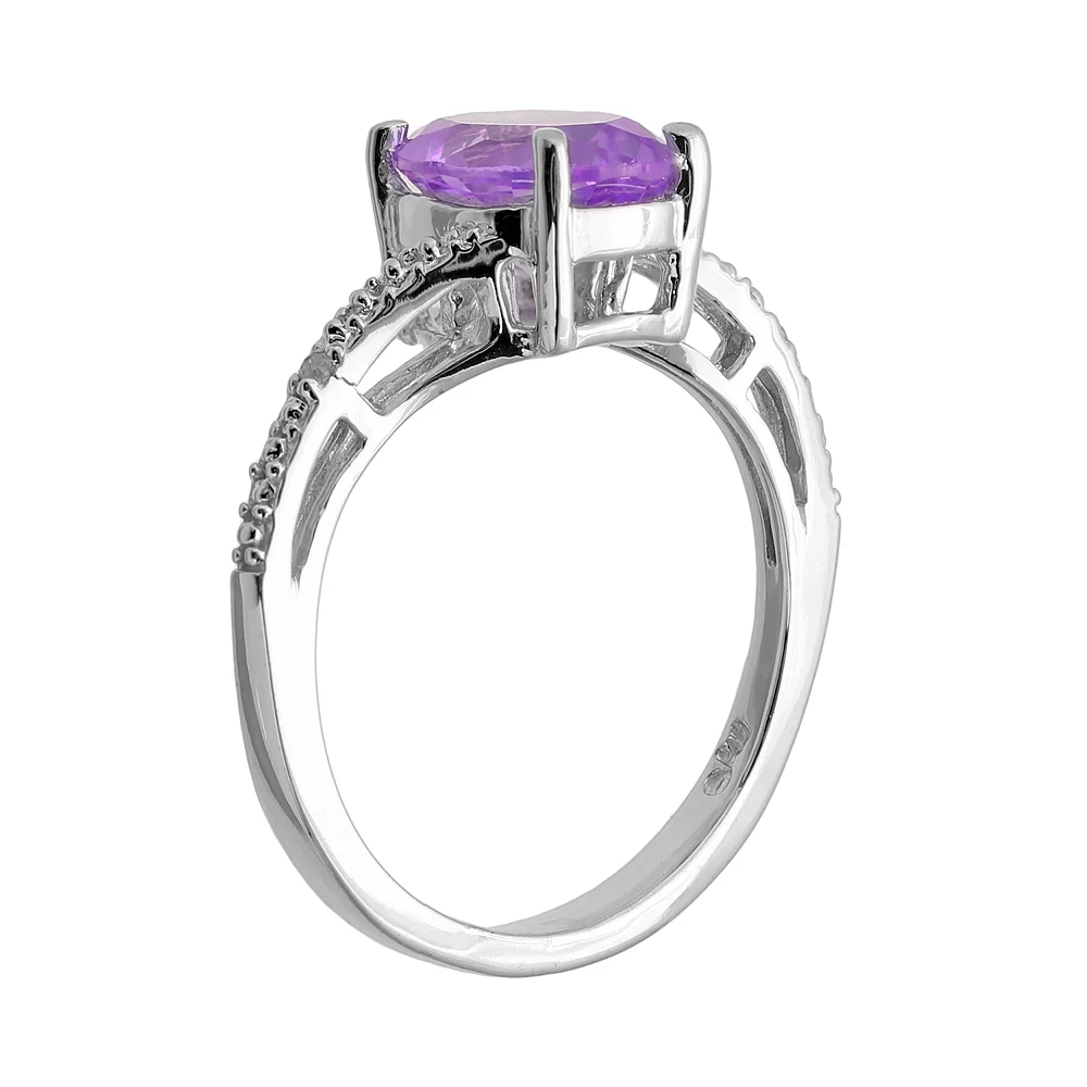 A genuine amethyst stone and diamond accents adorn this sterling silver ring for understated elegance.