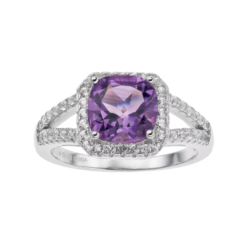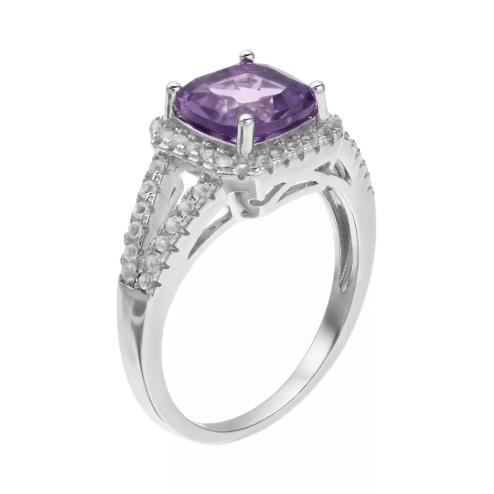 Featuring a split-shank design and a dazzling amethyst topaz center stone, this sterling silver halo ring is uniquely beautiful.