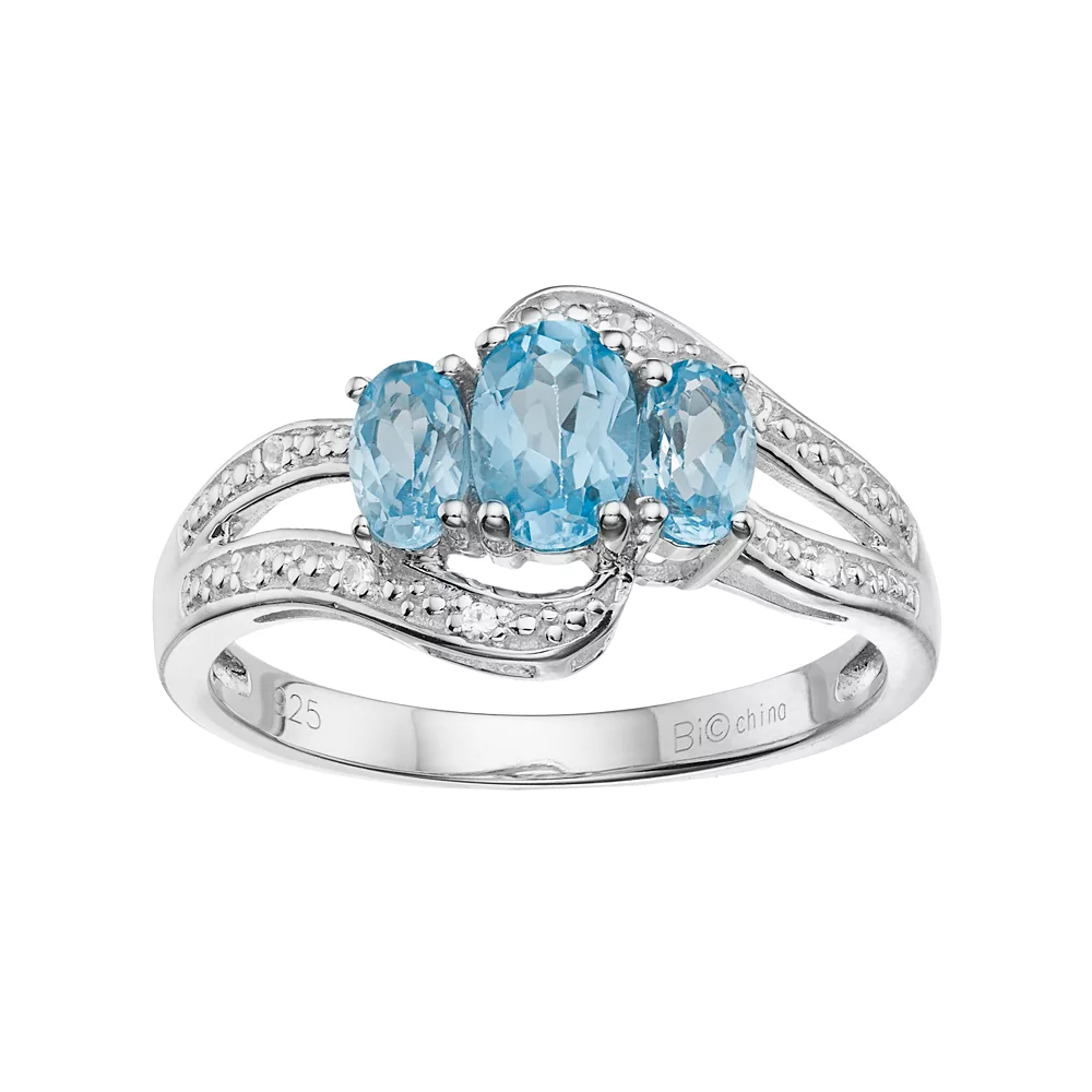 Designed with three blue topaz stones between white topaz accents, this sterling silver bypass ring is a remarkable complement to any ensemble.
