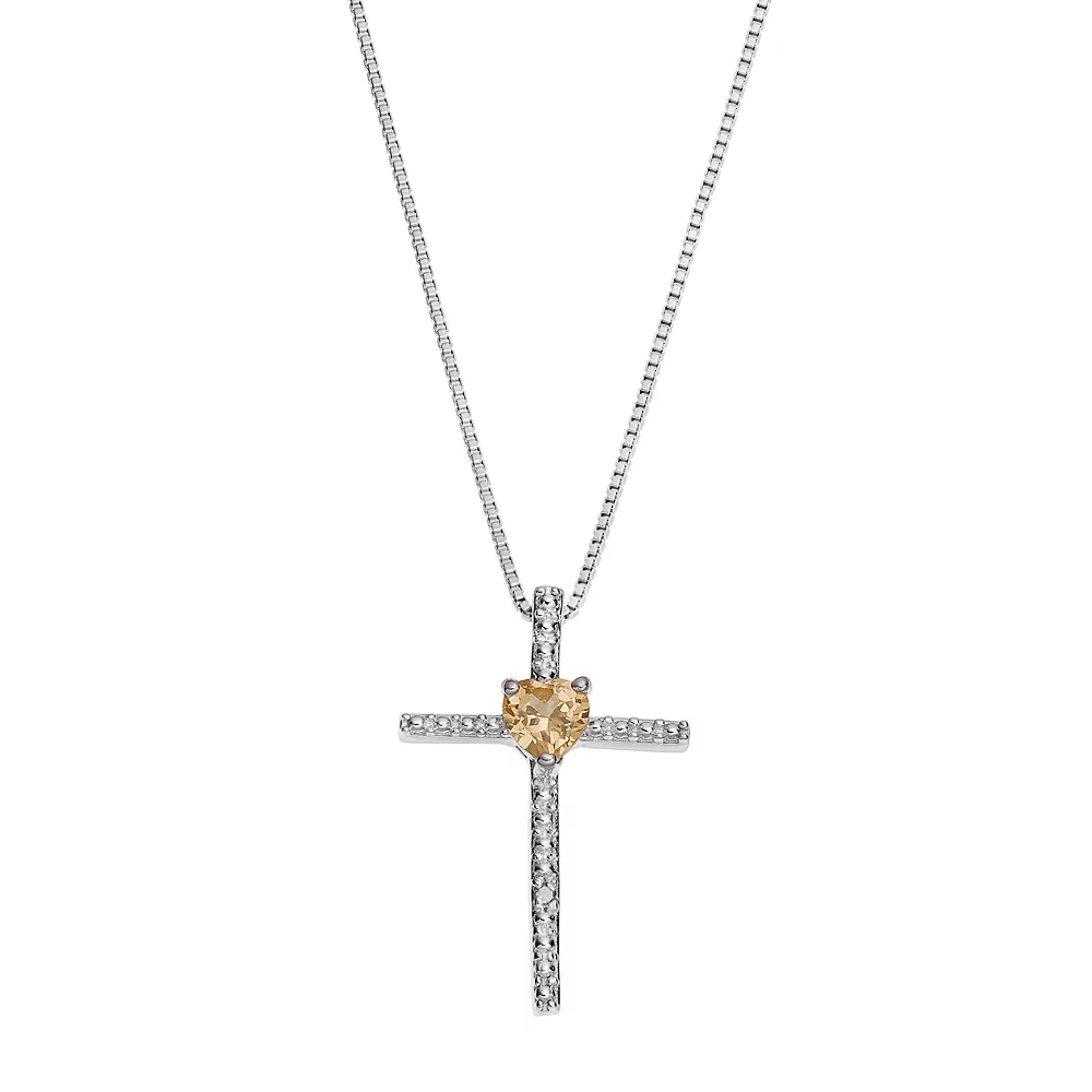 Decorated with a heart-cut genuine citrine center stone and diamond accent, this sterling silver cross necklace beautifully exemplifies your faith. Comes in a gift box.
