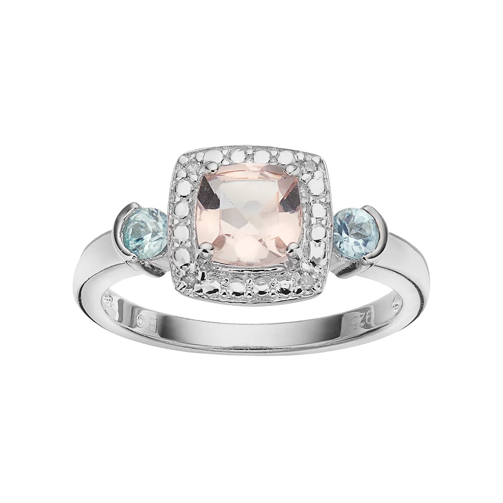 Adorned with a cushion-cut genuine morganite center stone, and decorated with aquamarine and diamond accents, this sterling silver ring is sure to light up your look.