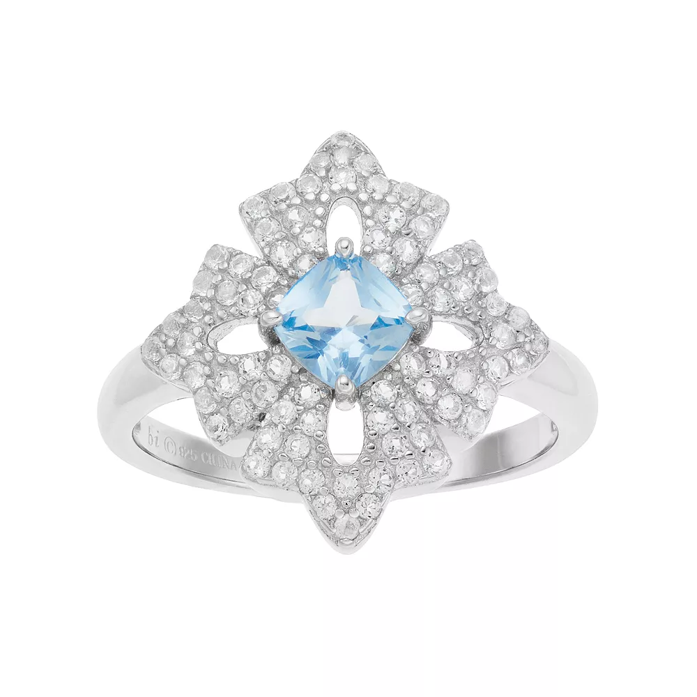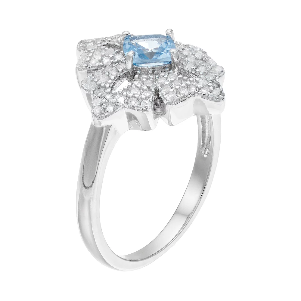 Adorned with a dazzling lab-created aquamarine center stone and white topaz accents, this sterling silver flower ring is sure to make a lasting impression.
