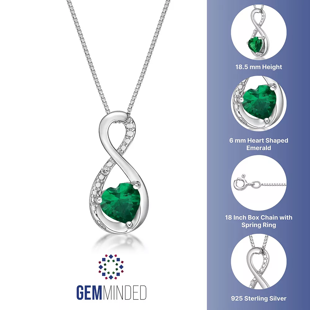 Featuring an infinity pendant adorned with a heart-shaped, lab-created emerald and a diamond accent, this sterling silver necklace adds endless charm to your ensembles.