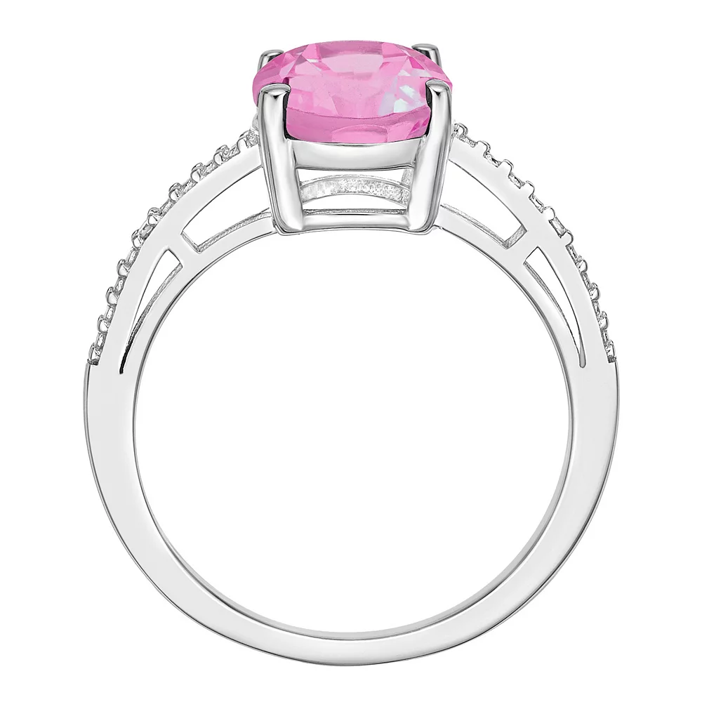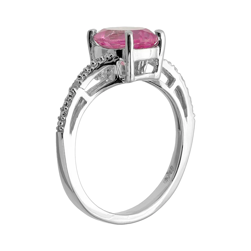 A lab-created pink sapphire stone and diamond accents adorn this sterling silver ring for understated elegance.
