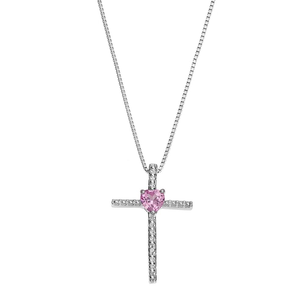 Decorated with a heart-cut, lab-created pink sapphire center stone and diamond accent, this sterling silver cross necklace beautifully exemplifies your faith. Comes in a gift box.