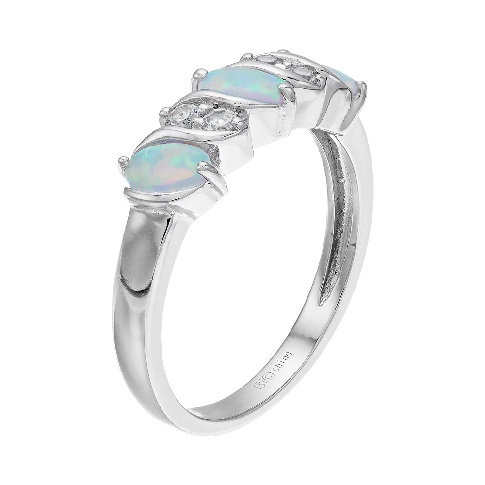 Decorated with three oval-shaped, lab-created white opals and pairs of white topaz accents, this sterling silver 3-stone ring is sure to captivate.